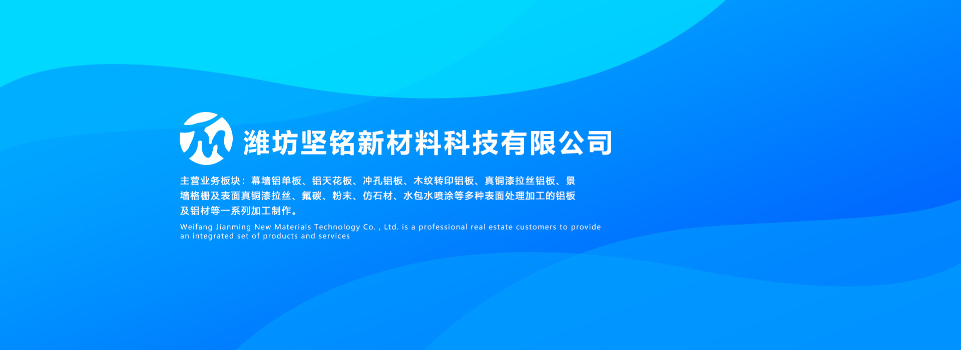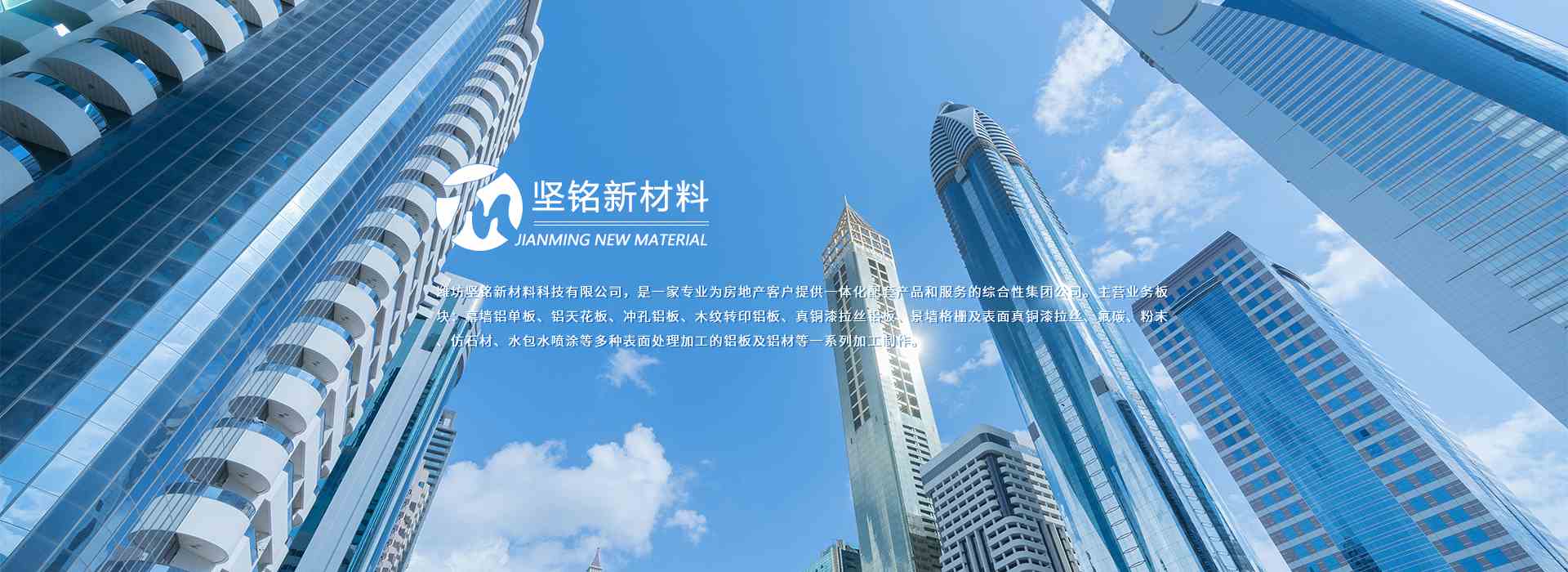 濰坊堅(jiān)銘新材料科技有限公司,是一家專(zhuān)業(yè)為房地產(chǎn)客戶(hù)提供一體化配套產(chǎn)品和服務(wù)的綜合性集團(tuán)公司。主營(yíng)業(yè)務(wù)板塊:幕墻鋁單板、鋁天花板、沖孔鋁板、木紋轉(zhuǎn)印鋁板、真銅漆拉絲鋁板、景墻格柵及表面真銅漆拉絲、氟碳、粉末、仿石材、水包水噴涂等多種表面處理加工的鋁板及鋁材等一系列加工制作。